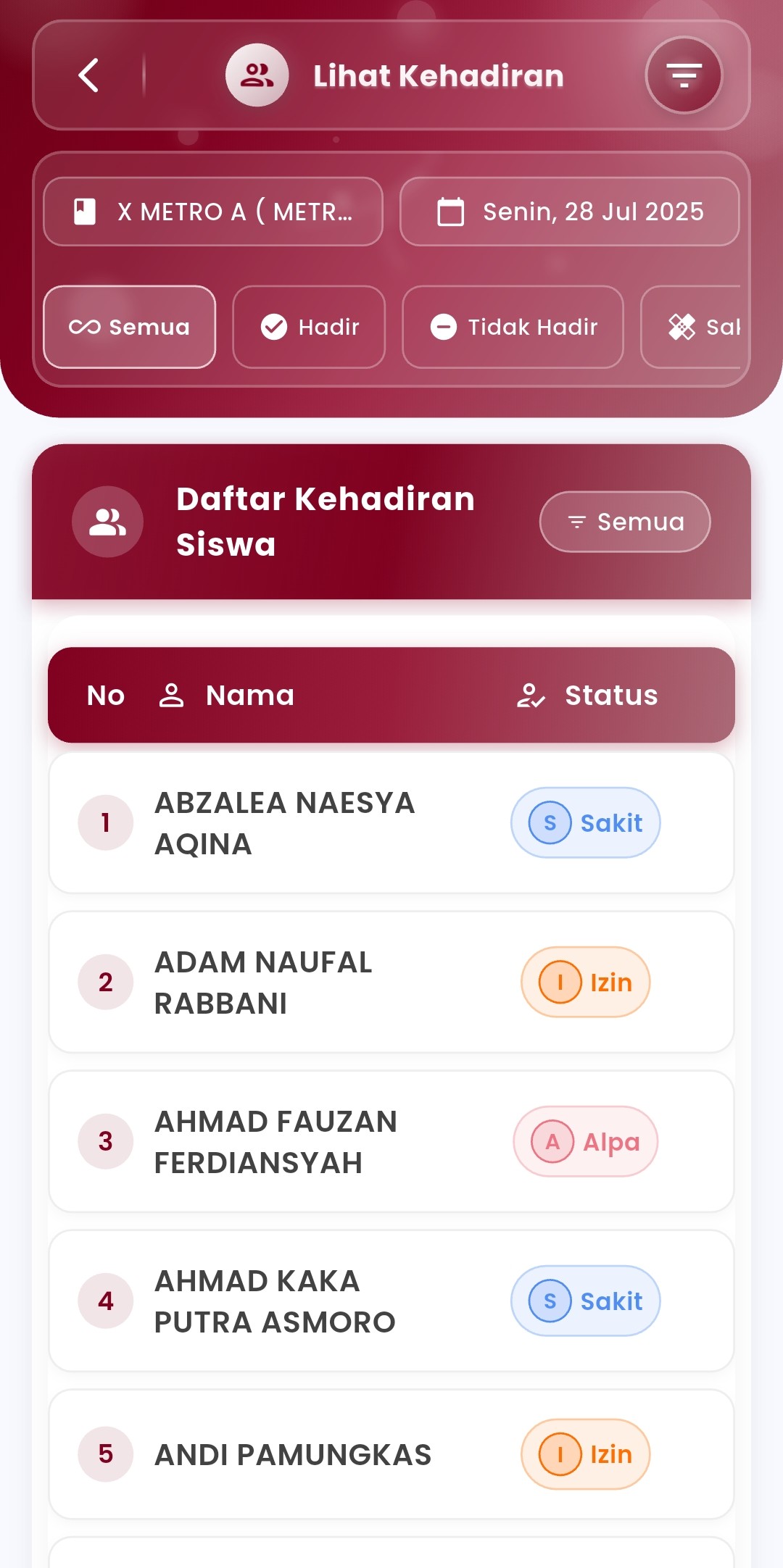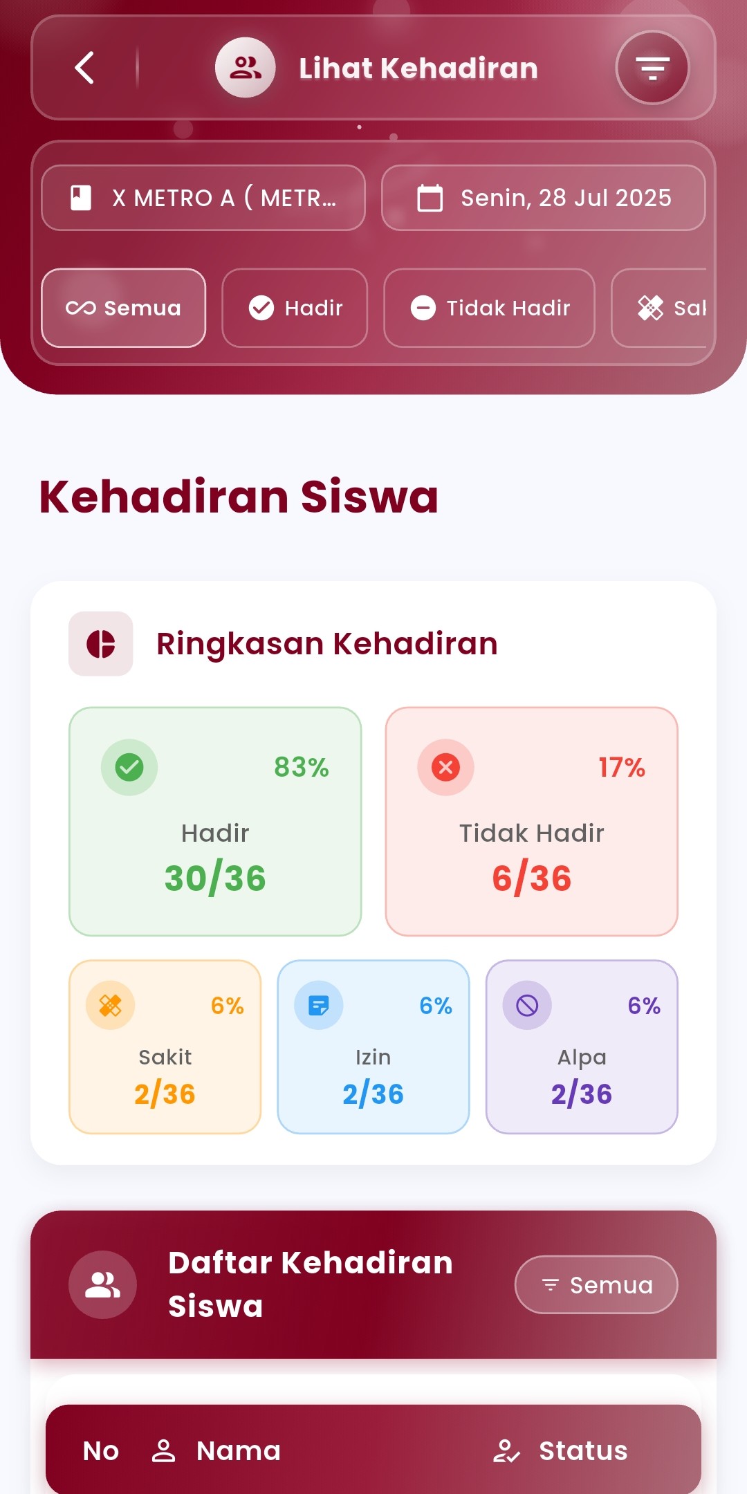 Displayed in a neat table with each student's attendance status, complete with different icons and colors to speed up identification. - Special Status Filter