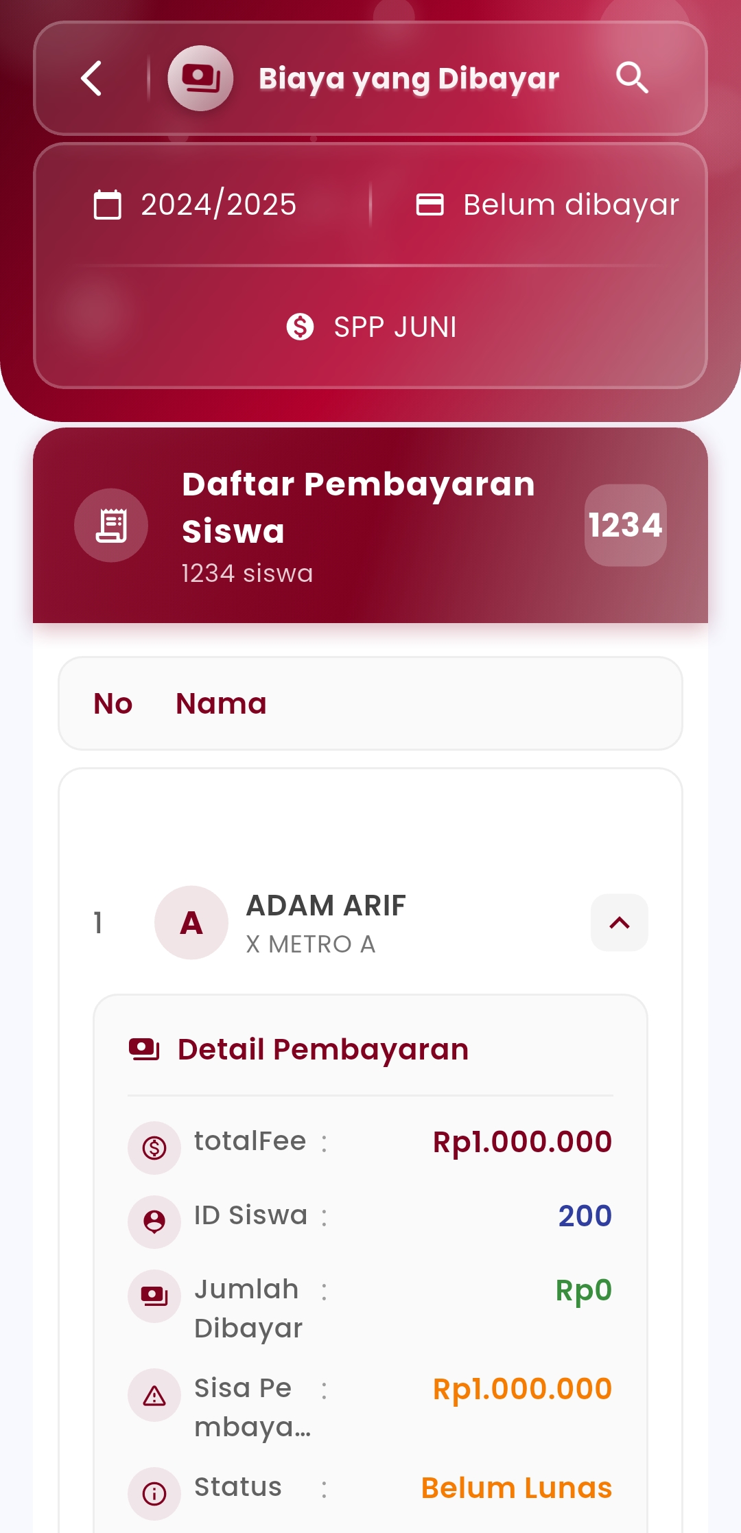 Track all student payment transactions in a structured and efficient manner in one view. This feature makes it easy for you to know the payment status of each student—whether fully paid or still having arrears.